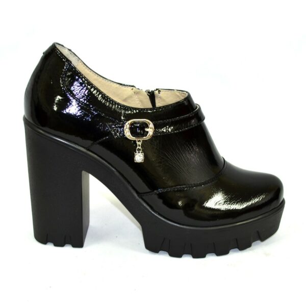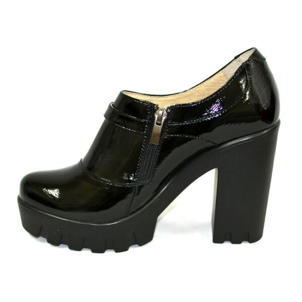 Закриті жіночі туфлі з натуральної лакової шкіри чорного кольору, на високому стійкому підборі 10,5 см, попереду 2,5 см . На блискавці. Ручної роботи з використанням виключно натуральних матеріалів високої якості. Повномірні, відповідають стандартній сітці розміру. Розраховані на стандартну повноту стегна. Можливий відшив у шкірі, замші різних кольорів.