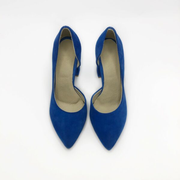 Молодіжні жіночі туфлі із загостреним носком на високому стійкому обтягнутому підборі 10 см. Виконаний із натуральної замші колір електрик. Ручної роботи з використанням виключно натуральних матеріалів високої якості. Відповідають стандартній розмірній сітці. Розраховані на стандартну повноту стегна. Можливий відшив у шкірі, замші різних кольорів.