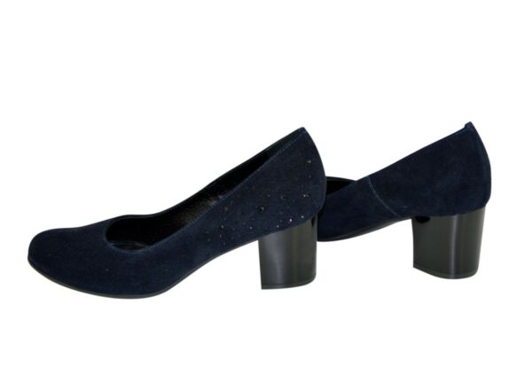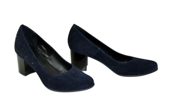 Човники-туфлі класичні жіночі із натуральної синьої замші на стійкому підборі висотою 6 см. Декоровані камінням. Ручна робота з використанням виключно натуральних матеріалів високої якості. Повномірні, відповідають стандартній сітці розміру. Можливий відшив у шкірі, замші різних кольорів.