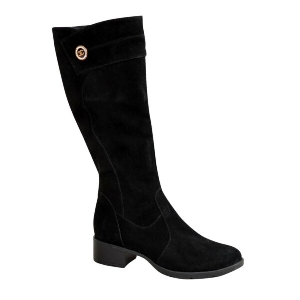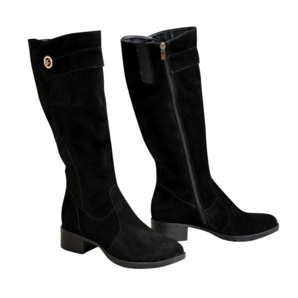 Женские сапоги из батали из натуральной замши черного цвета, с резинкой в верхней части сапога. На широком подборе. Объем голени можно заказать от 34 см до 45 см для любого размера.