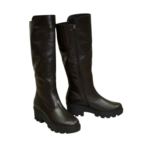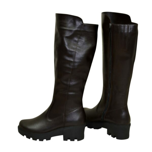 Женские сапоги из натуральной кожи шоколадного цвета с резинкой в верхней части сапога. На утолщенной тракторной подошве. Объем голени можно заказать от 34 см до 48 см для любого размера.