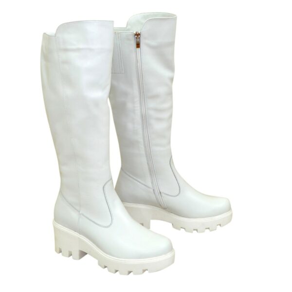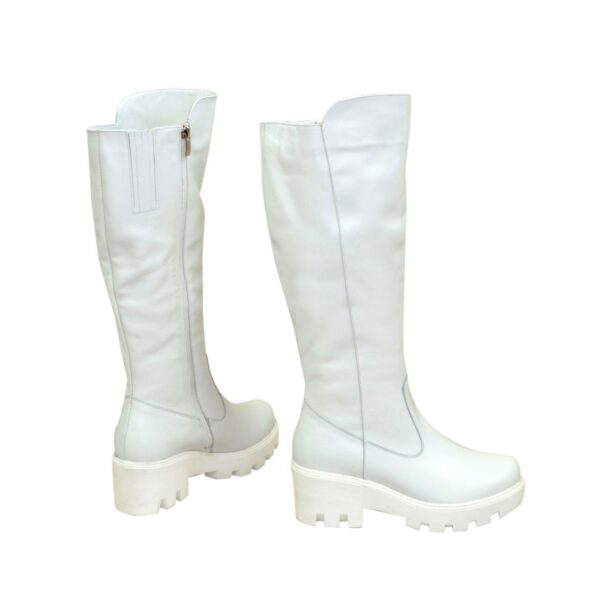 Женские сапоги из натуральной кожи белого цвета с резинкой в верхней части сапога. На утолщенной тракторной подошве. Объем голени можно заказать от 34 см до 48 см для любого размера.