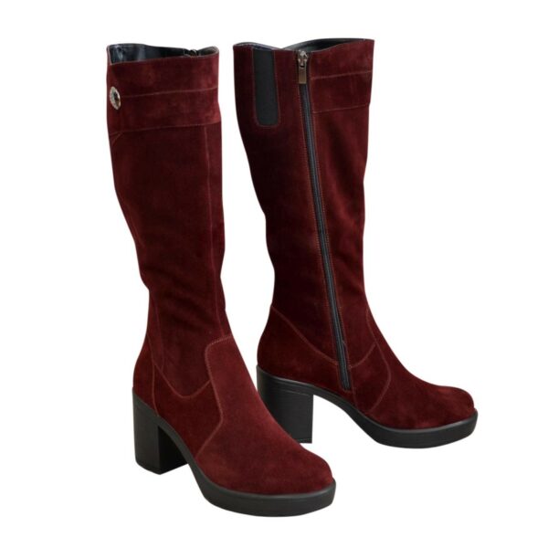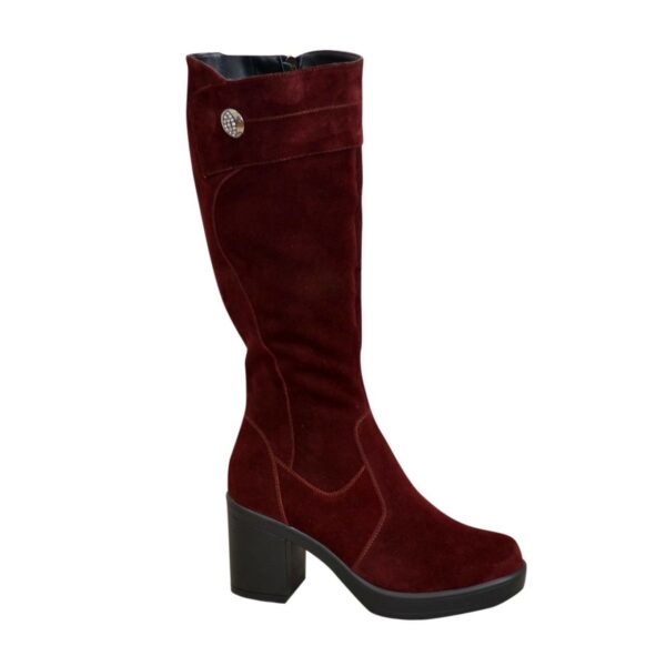 Женские сапоги с широкой голенистой батали из натуральной замши бордового цвета, с резинкой в верхней части сапога. Украшенные фурнитурой. На стойком каблуке. Объем голени можно заказать от 34 см до 45 см для любого размера.