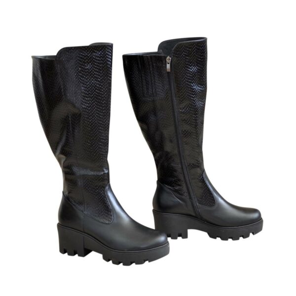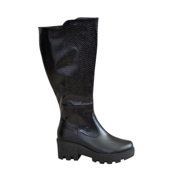 Женские сапоги с широким голенищем – батали из натуральной кожи и питона черного цвета, с резинкой в верхней части сапога. На утолщенной подошве. Объем голени можно заказать от 34 см до 48 см для любого размера.