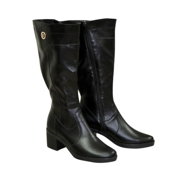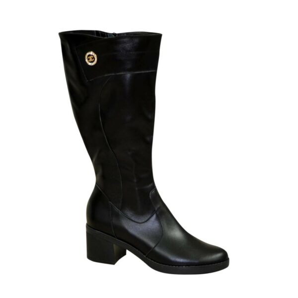 Женские сапоги с широкой голенистой батали из натуральной кожи черного цвета, с резинкой в верхней части сапога. Украшенные фурнитурой. На стойком каблуке. Объем голени можно заказать от 34 см до 45 см для любого размера.