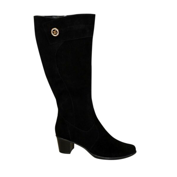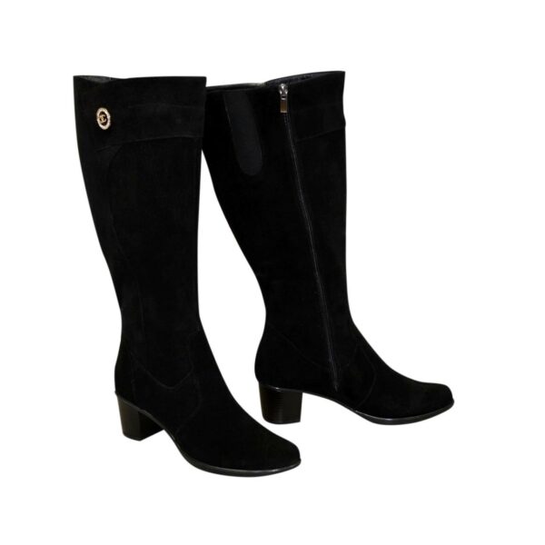 Женские сапоги с широкой голенистой батали из натуральной замши черного цвета, с резинкой в верхней части сапога. Украшенные фурнитурой. На стойком каблуке. Объем голени можно заказать от 34 см до 45 см для любого размера.