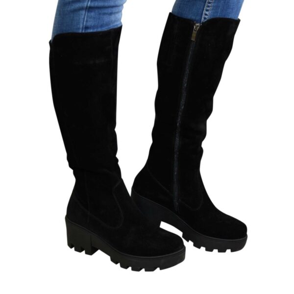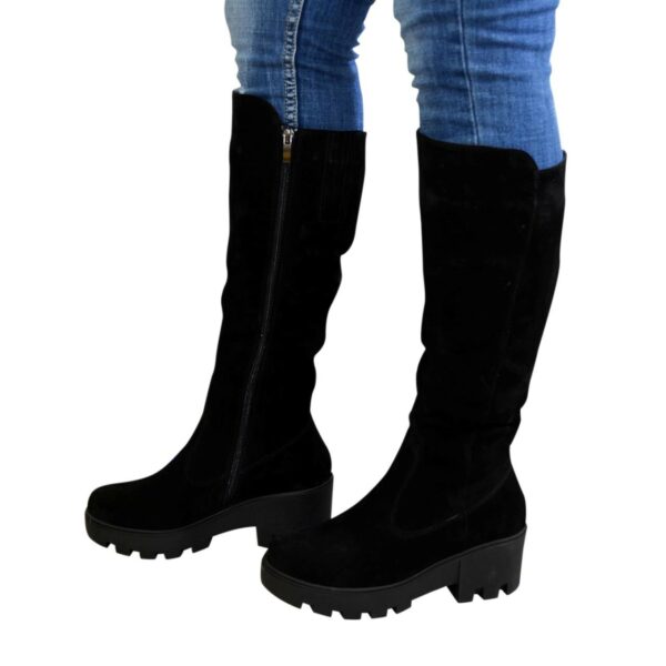 Женские сапоги из натуральной замши черного цвета с резинкой в верхней части сапога. На утолщенной тракторной подошве. Объем голени можно заказать от 34 см до 48 см для любого размера.