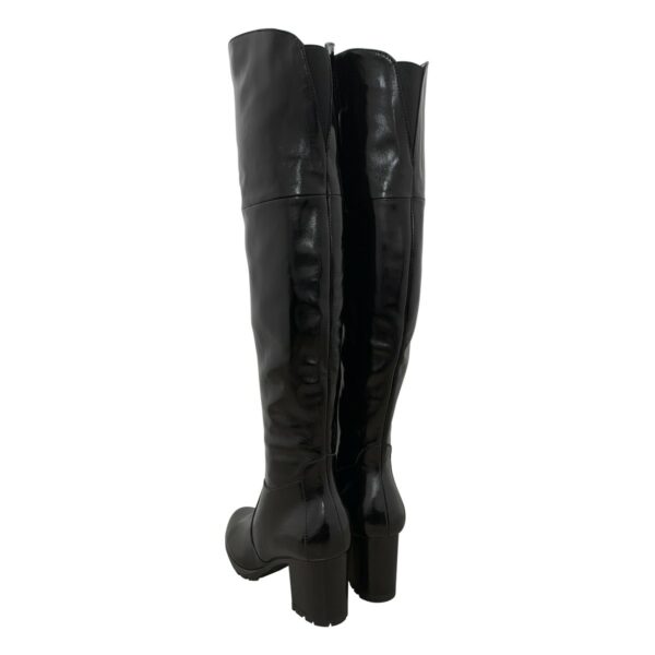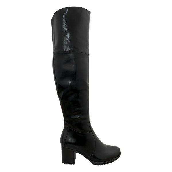 Стильні жіночі ботфорти із натуральної лакової шкіри чорного кольору, з гумкою у верхній частині чобота, на потовщеній підошві.