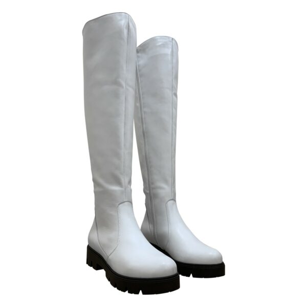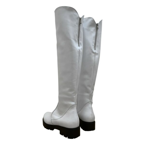 Стильные женские ботфорты из натуральной кожи белого цвета с регулировочным клапаном в верхней части сапога на утолщенной подошве.