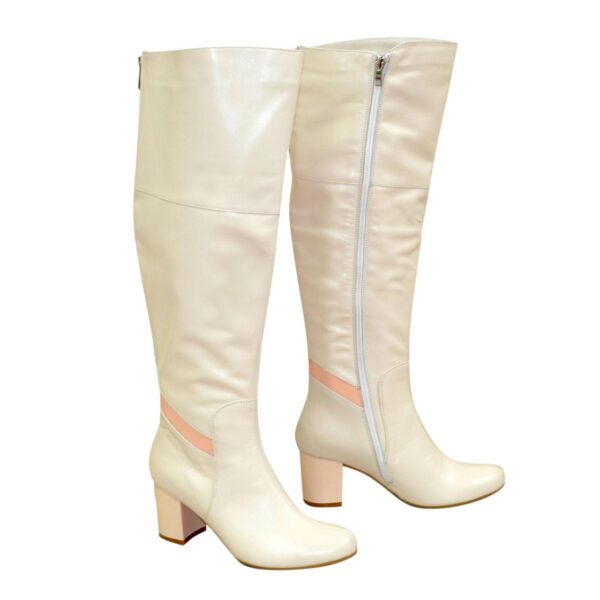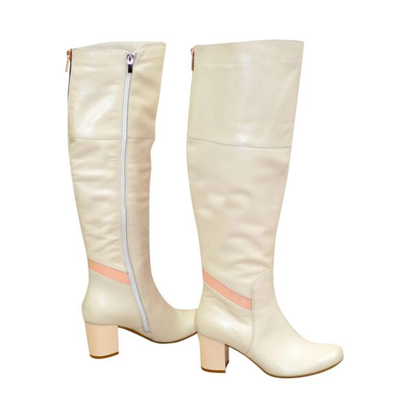 Стильные женские ботфорты из натуральной кожи бежевого цвета, с резинкой в верхней части сапога, на стойком каблуке.