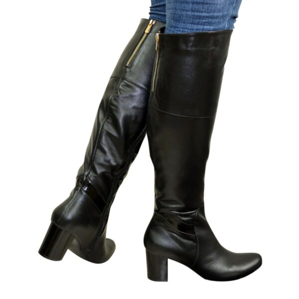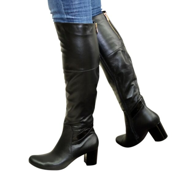 Стильные женские ботфорты из натуральной кожи черного цвета с резинкой в верхней части сапога.