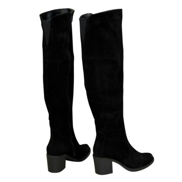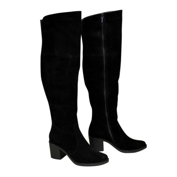 Стильные женские ботфорты из натуральной замши черного цвета с резинкой в верхней части сапога, на утолщенной подошве.