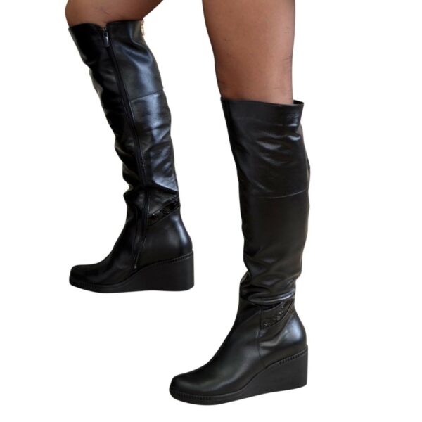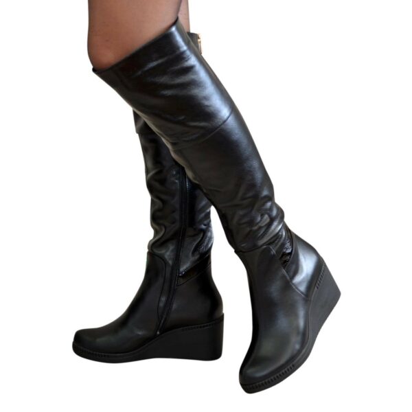Стильные женские ботфорты из натуральной кожи черного цвета с резинкой в верхней части сапога на танкетке.