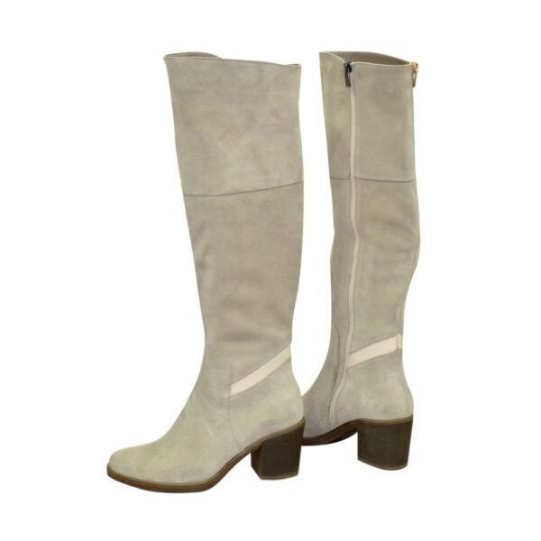 Стильные женские ботфорты из замши серого цвета, с резинкой в верхней части сапога, на утолщенной подошве.