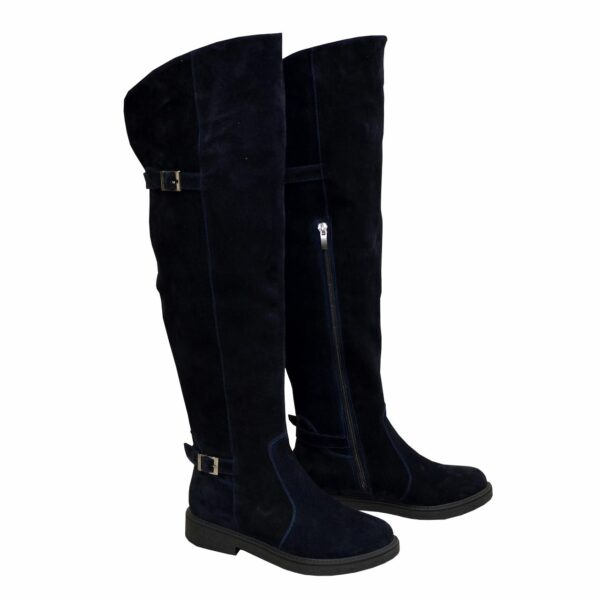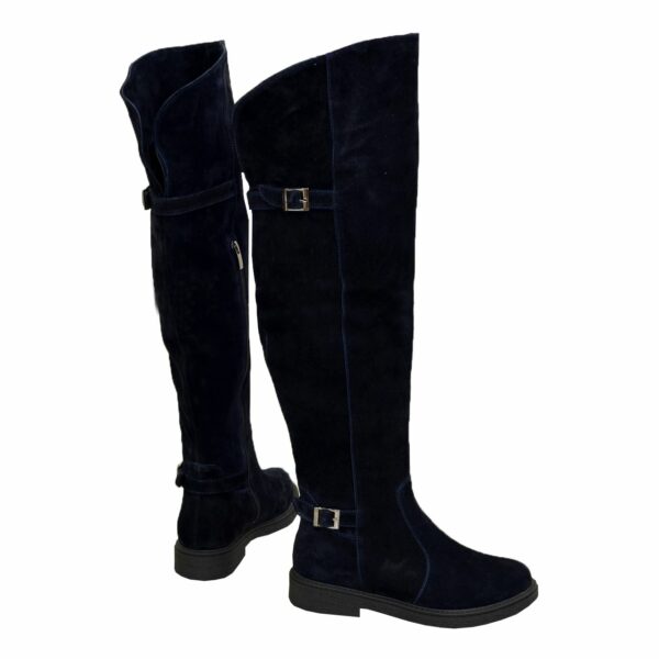 Стильные ботфортовые сапоги из натуральной замши синего цвета, декорированные ремешками, на утолщенной подошве. Удобная утолщенная подошва делает их идеально комфортными и практичными.