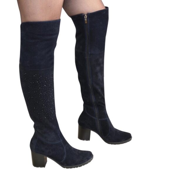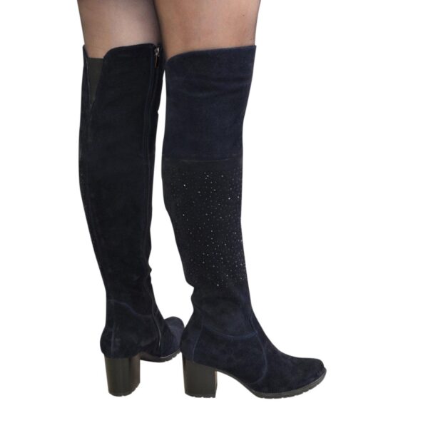 Стильные женские ботфорты из натуральной замши синего цвета с резинкой в верхней части сапога, на утолщенной подошве. Декорированные камни. Объем голени можно заказать от 35 см до 40 см для любого размера.