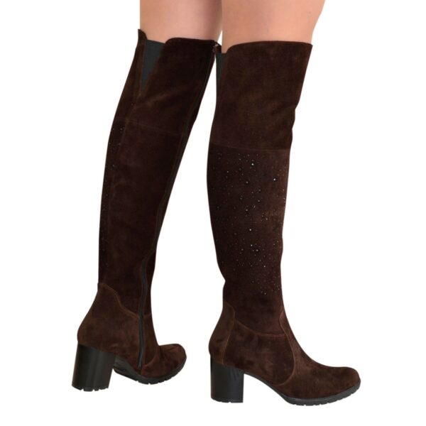 Стильные женские ботфорты из натуральной замши коричневого цвета с резинкой в верхней части сапога на утолщенной подошве. Украшенные камнями. Объем голени можно заказать от 35 см до 40 см для любого размера.
