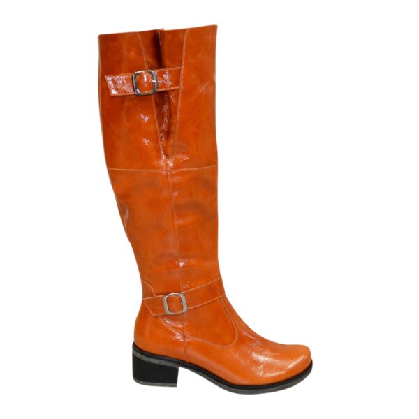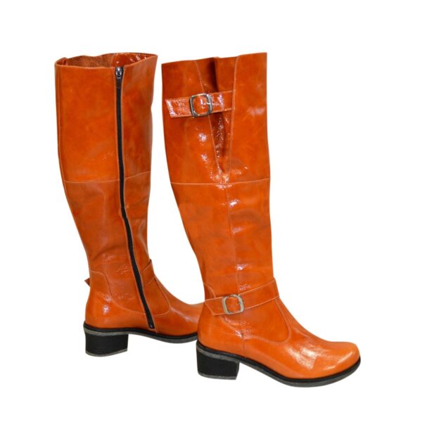 Стильные женские сапоги из натуральной кожи рыжего цвета с регулировочным клапаном в верхней части сапога, на утолщенной подошве.