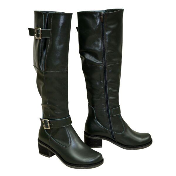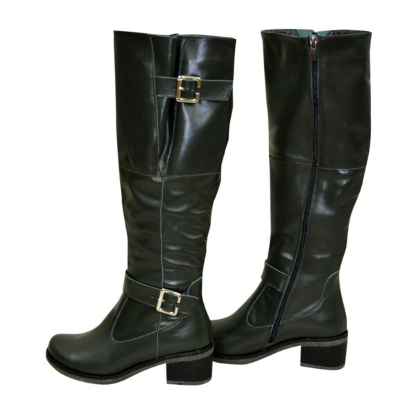 Стильные женские ботфорты сапоги из натуральной кожи зеленого цвета с регулировочным клапаном в верхней части сапога на толстой литой подошве.