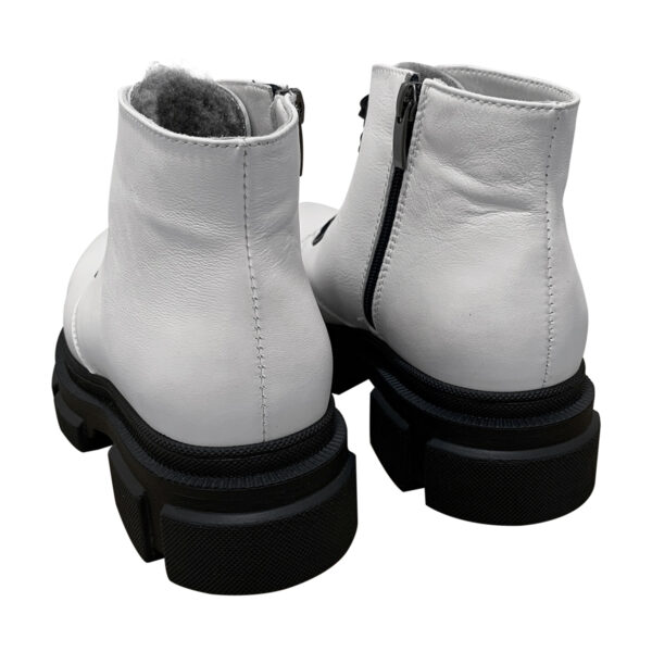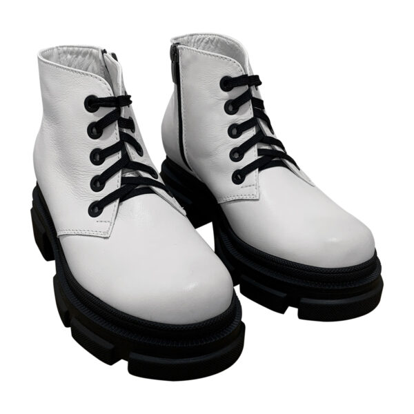Классические женские ботинки на утолщенной тракторной подошве изготовлены из белой натуральной кожи. С молнией и шнуровкой, благодаря которой регулируется подъем. Очень удобные, идеально сидящие на ножке.
