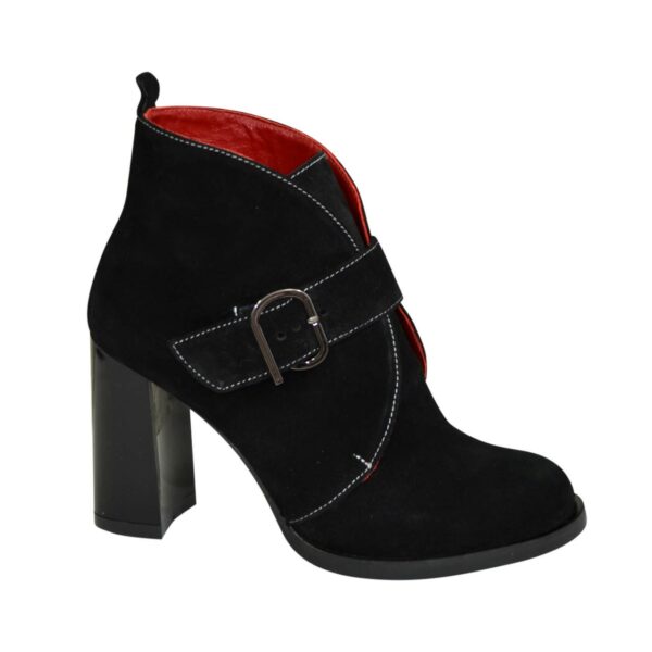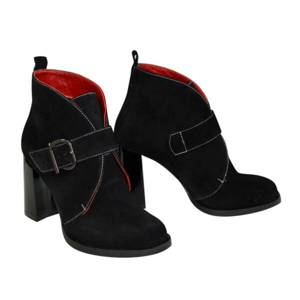 Классические женские ботинки на высоком стойком каблуке, изготовленные из натуральной замши черного цвета. Подъем регулируется ремешком. Очень удобные, идеально сидящие на ножке.