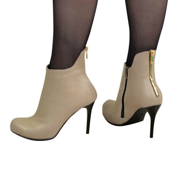 Классические женские ботинки на шпильке, изготовленные из натуральной кожи цвета визон. В части пяти декорированы молнией. Комфортные и элегантные, идеально сидящие на ножке.