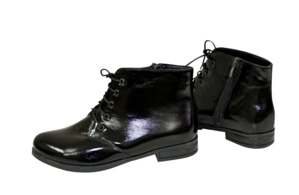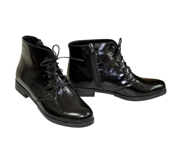 Классические женские ботинки на низком ходу с маленьким кольцом из натуральной лаковой кожи черного цвета. С молнией и шнуровкой, благодаря которой регулируется подъем. Очень удобные, идеально сидящие на ножке.