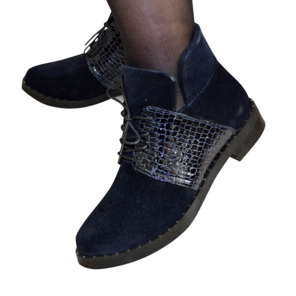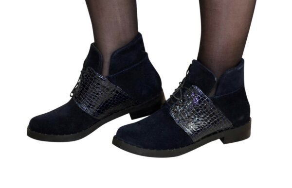 Стильные классические женские ботинки на невысоком каблуке, изготовленные из натуральной замши и кожи "рептилия" синего цвета, с помощью шнуровки регулируется подъемом. Очень удобные, идеально сидящие на ножке.