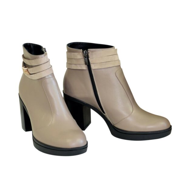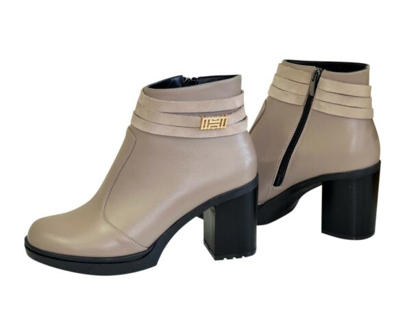 Элегантные классические женские ботинки на широком стойком каблуке, изготовлены из натуральной кожи с ремешками из замши цвета визон и украшением в виде пряжки золотого цвета. Очень удобные, идеально сидящие на ножке.