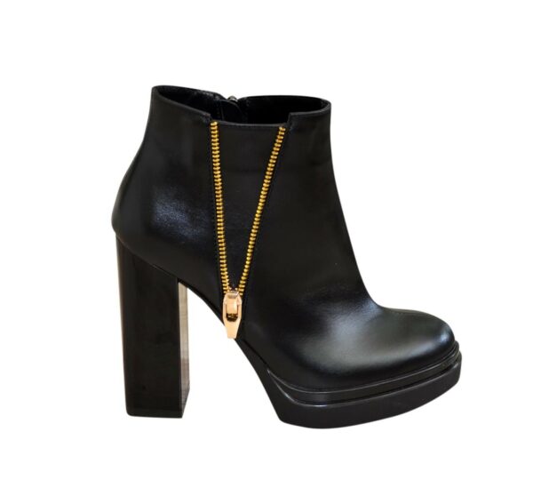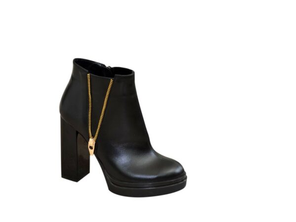 Стильные женские ботинки на высоком стойком каблуке, изготовлены натуральной кожи черного цвета, декорированы молнией. Очень удобные, идеально сидящие на ножке.