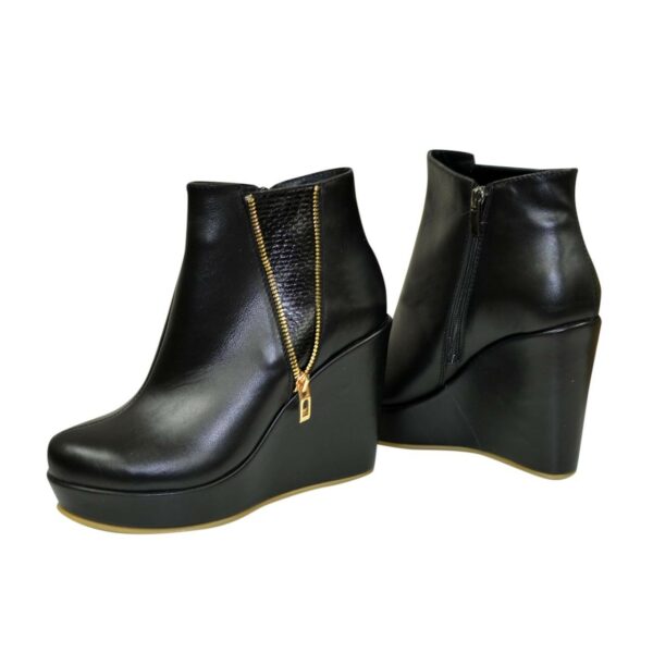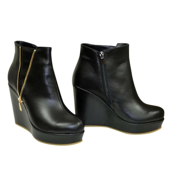 Стильные женские ботинки на высокой платформе изготовлены из натуральной кожи черного цвета, декорированы молнией и вставкой из натуральной кожи черного цвета, с тиснением "рептилии". Очень удобные, идеально сидящие на ножке.