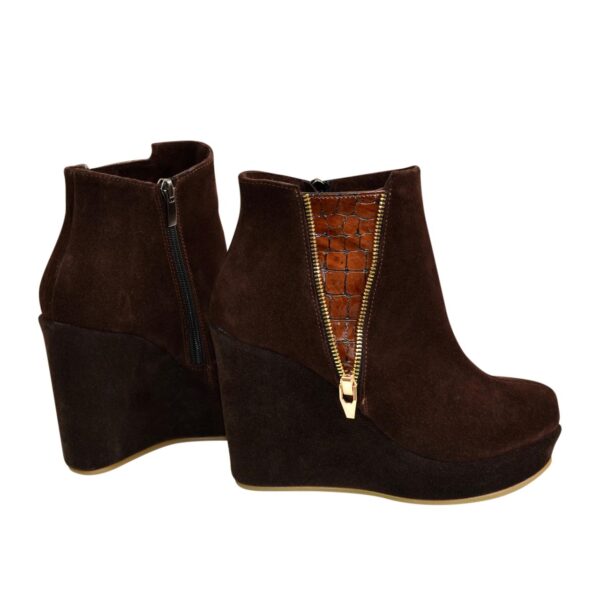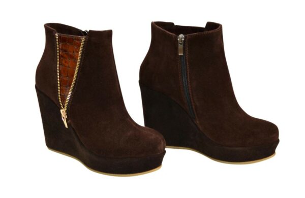 Стильные женские ботинки на высокой платформе изготовлены из натуральной замши коричневого цвета, декорированы молнией и вставкой из натуральной лаковой кожи коричневого цвета с тиснением «рептилии». Очень удобные, идеально сидящие на ножке.