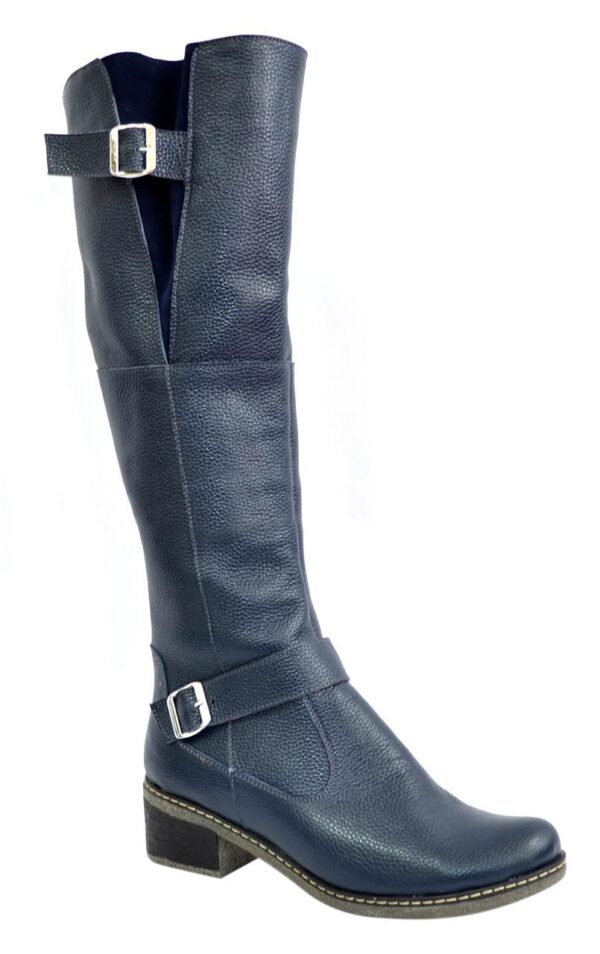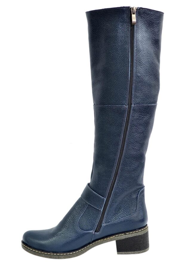 Стильные женские ботфорты сапоги из натуральной кожи синего цвета с регулировочным клапаном в верхней части сапога на утолщенной литой подошве.