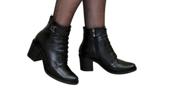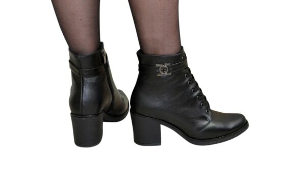 Женские классические ботильоны на удобном невысоком каблуке, изготовленные из натуральной кожи черного цвета. Со шнуровкой, с помощью которой регулируется подъем. Декорированный ремешком с пряжкой. Застежка-молния. Очень удобные, идеально сидящие на ножке.