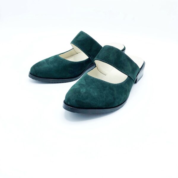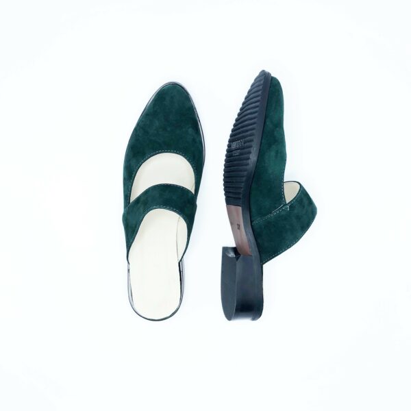Зручні мюлі на стійкому підборі 2.5см, із натуральної замші зеленого кольору, відповідають стандартній розмірній сітці. Можливий відшив у шкірі, замші різних кольорів.
