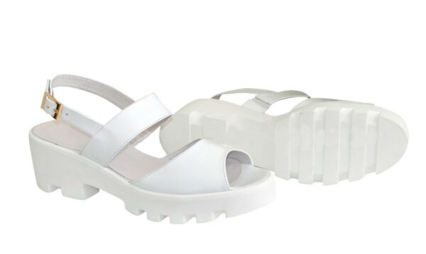 Стильные женские босоножки из белой натуральной кожи на тракторной танкетке. Высота платформы 5,5 см, подошвы – 3 см . полномерные соответствуют стандартной размерной сетке. Стелька обтянута светлой кожей. Возможен отшив в коже, замши разных цветов.