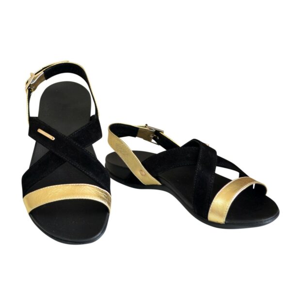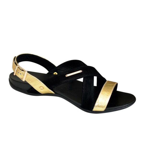 Удобные босоножки на легкой полиуретановой подошве из натуральной кожи золотого и натуральной замши черного цвета соответствуют стандартной размерной сетке. Рассчитаны на стандартную полноту бедра. Возможен отшив в коже, замши разных цветов.