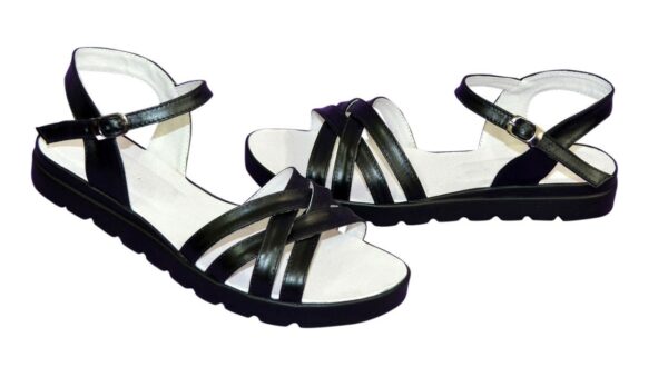 Легкие летние босоножки на сплошной подошве из натуральной кожи черного цвета. Стелька обтянута светлой кожей. Застежка регулирует высоту подъема. Полномерные соответствуют стандартной сетке размера. Возможен отшив в коже, замши разных цветов.