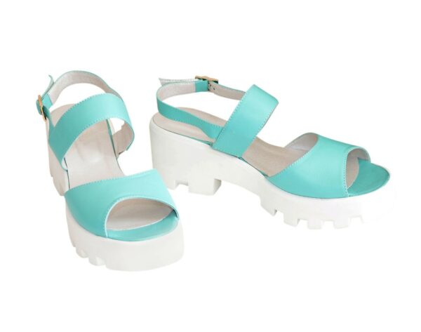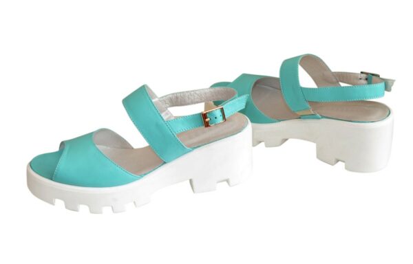 Нарядные женские босоножки из натуральной мятной кожи на очень удобной танкетке. Высота платформы 5,5 см, подошвы – 3 см . полномерные соответствуют стандартной размерной сетке. Стелька обтянута светлой кожей. Возможен отшив в коже, замши разных цветов.