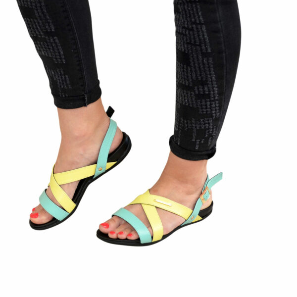 Удобные босоножки на легкой полиуретановой подошве из натуральной кожи желтого и мятного цветов соответствуют стандартной сетке. Рассчитаны на стандартную полноту бедра. Возможен отшив в коже, замши разных цветов.