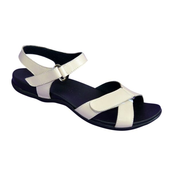 Легкие летние босоножки на литой ортопедической подошве, из натуральной кожи бежевого цвета, с регулирующей подъем застежкой. Благодаря дополнительной фиксации голеностопа их удобно носить и преодолевать в них длительные дистанции. Полномерные соответствуют стандартной сетке размера. Возможен отшив в коже, замши разных цветов.