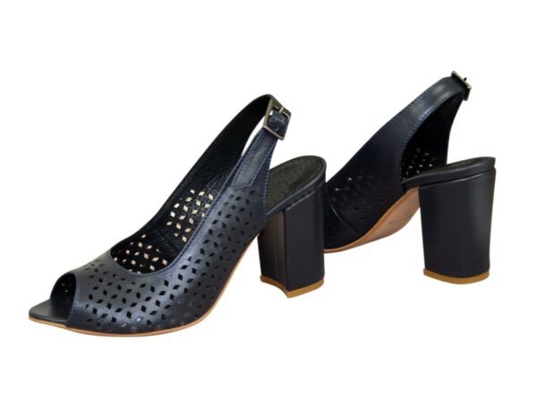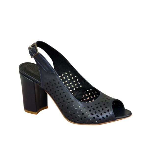 Нарядные стильные женские босоножки на стойком каблуке обтянутом кожей высотой 8.5 см. из натуральной кожи синего цвета со сквозной перфорацией, благодаря дополнительной фиксации голеностопа их удобно носить. Полномерные соответствуют стандартной сетке размера. Возможен отшив в коже, замши разных цветов.