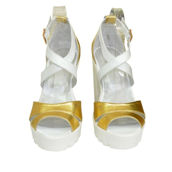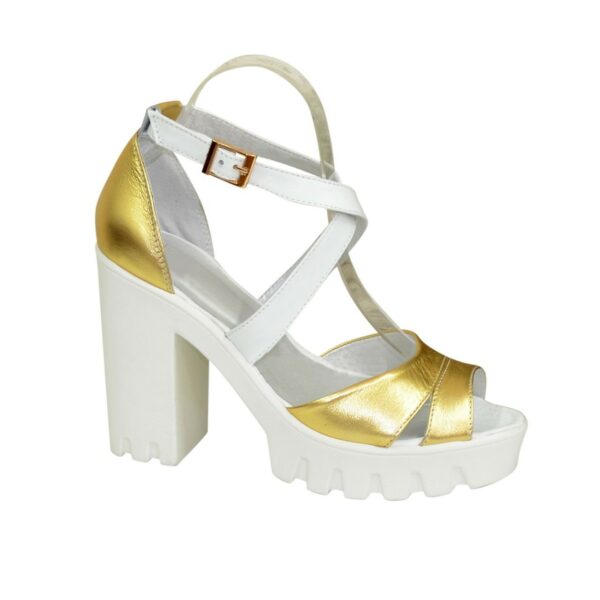 Нарядные женские босоножки с задником, на облегченной полиуретановой подошве трактора Высота каблука 10,5 см, впереди 2,5 см из натуральной кожи золотого цвета. Благодаря дополнительной фиксации голеностопа их удобно носить. Соответствуют стандартной размерной сетке. Полномерные, рассчитанные на стандартную полноту бедра. Возможен отшив в коже, замши разных цветов.
