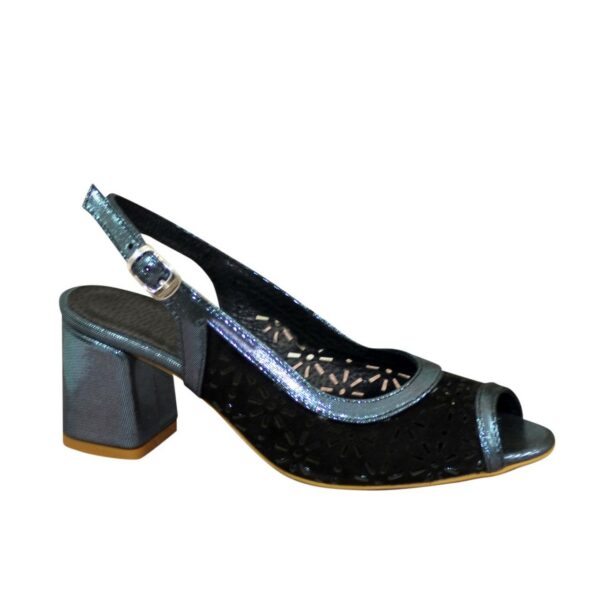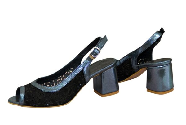 Элегантные женские босоножки, из перфорированной натуральной замши черного цвета в комбинации с натуральным сатином синего цвета, на стойком обтянутом подборе 5.5 см. Благодаря дополнительной фиксации голеностопа их удобно носить и преодолевать в них длительные дистанции. Полномерные соответствуют стандартной сетке размера. Возможен отшив в коже, замши разных цветов.
