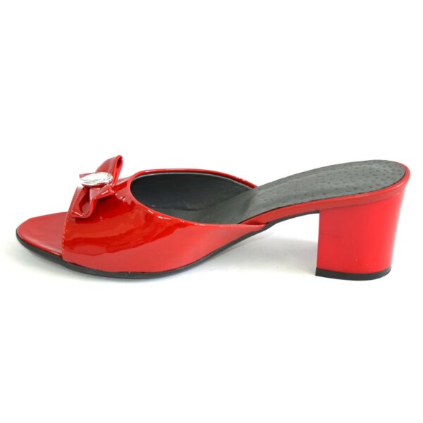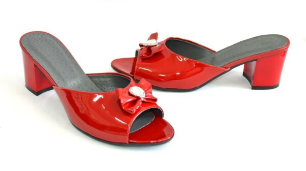 Элегантные сабо, из натуральной лаковой кожи красного цвета, с декорацией из банта и фурнитуры, на стойком лаковом подборе 5.5 см есть резинка, полномерные соответствуют стандартной размерной сетке. Возможен отшив в коже, замши разных цветов.