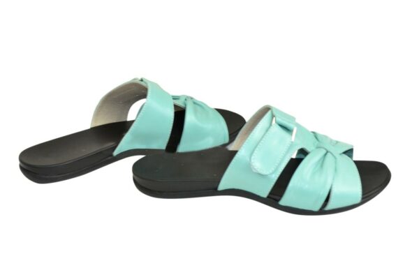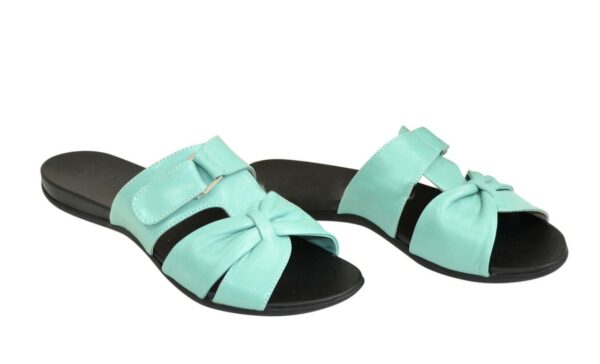 Удобные шлепки на легкой полиуретановой подошве, из натуральной кожи мятного цвета, полномерны соответствуют стандартной сетке. Подъем регулируется липучкой, подойдет на полную ногу. Возможен отшив в коже, замши разных цветов.