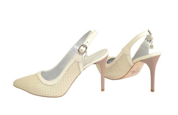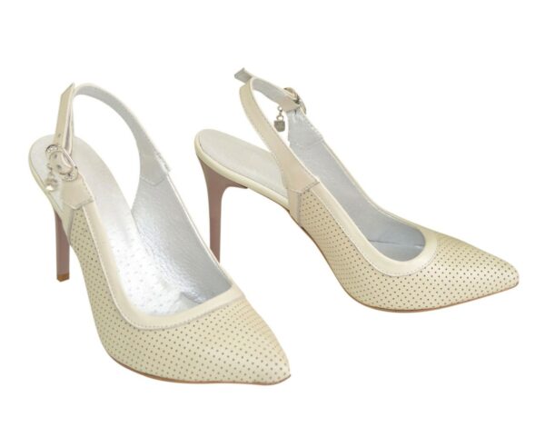 Витончені жіночі босоніжки-туфлі з гострим шкарпеткою на шпильці 9.5 см. підошва блочна. З натуральної шкіри бежевого кольору. Повномірні, розраховані на стандартну повноту стегна. Відповідають стандартній розмірній сітці. Можливий відшив у шкірі, замші різних кольорів.