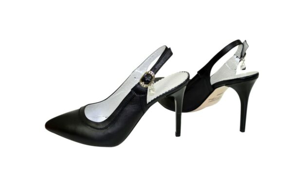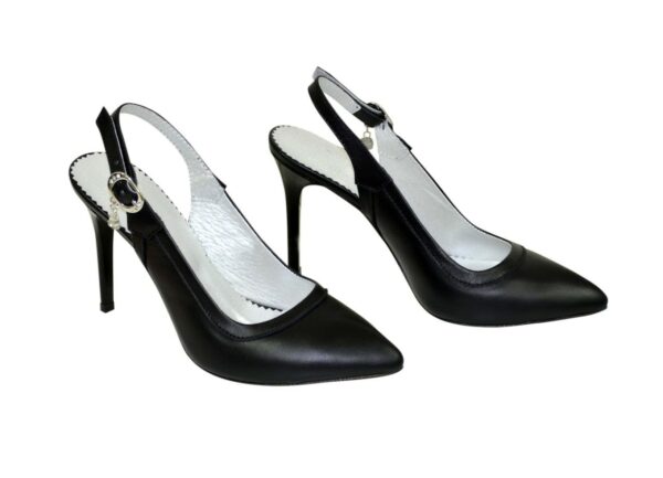 Витончені жіночі босоніжки-туфлі з гострим шкарпеткою на шпильці 9.5 см. підошва блочна. Зі натуральної шкіри чорного кольору. Повномірні, розраховані на стандартну повноту стегна. Відповідають стандартній розмірній сітці. Можливий відшив у шкірі, замші різних кольорів.