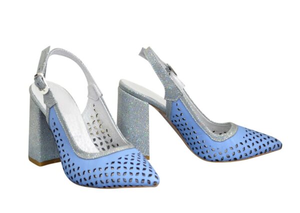 Витончені жіночі босоніжки-туфлі з гострим носком на обтяжному підборі 10 см. підошва блочна. З натуральної шкіри блакитного кольору із наскрізною перфорацією. Повномірні, розраховані на стандартну повноту стегна. Відповідають стандартній розмірній сітці. Можливий відшив у шкірі, замші різних кольорів.