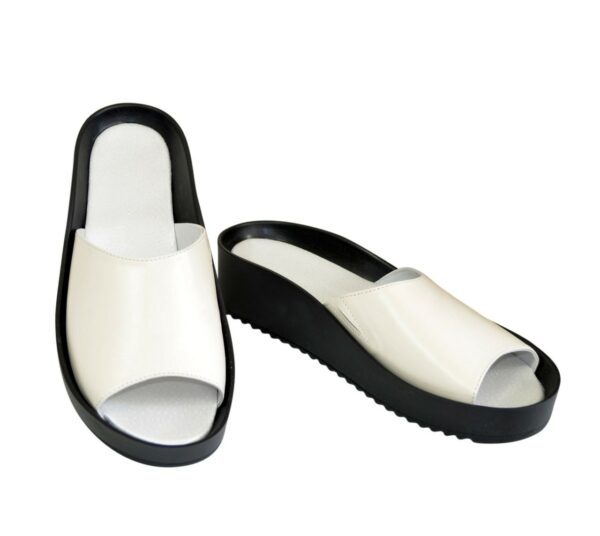 Удобные шлепки на легкой полиуретановой подошве, из натуральной кожи цвета беж, с резинкой соответствуют стандартной сетке. На узкую и среднюю ногу. Возможен отшив в коже, замши разных цветов.